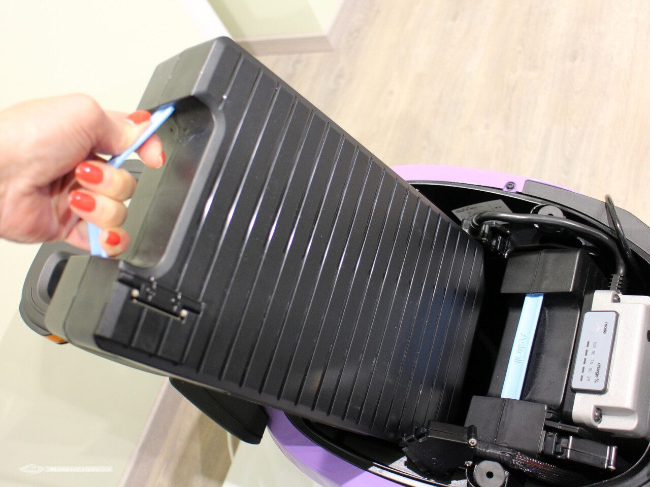 El scooter incluye dos baterías de Litio extraíbles de 1,4 kWh para una autonomía de 96 km. Las baterías pueden cargarse en 210 minutos.