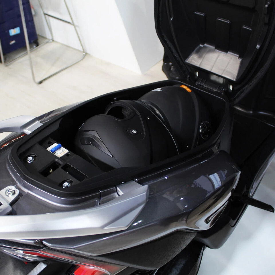 El patinete dispone de un amplio compartimento de almacenamiento de 36 litros bajo el asiento que permite guardar un casco.