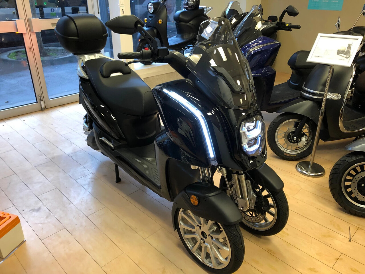 El escúter está disponible en varios colores y se puede equipar con un baúl superior.