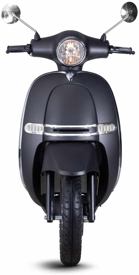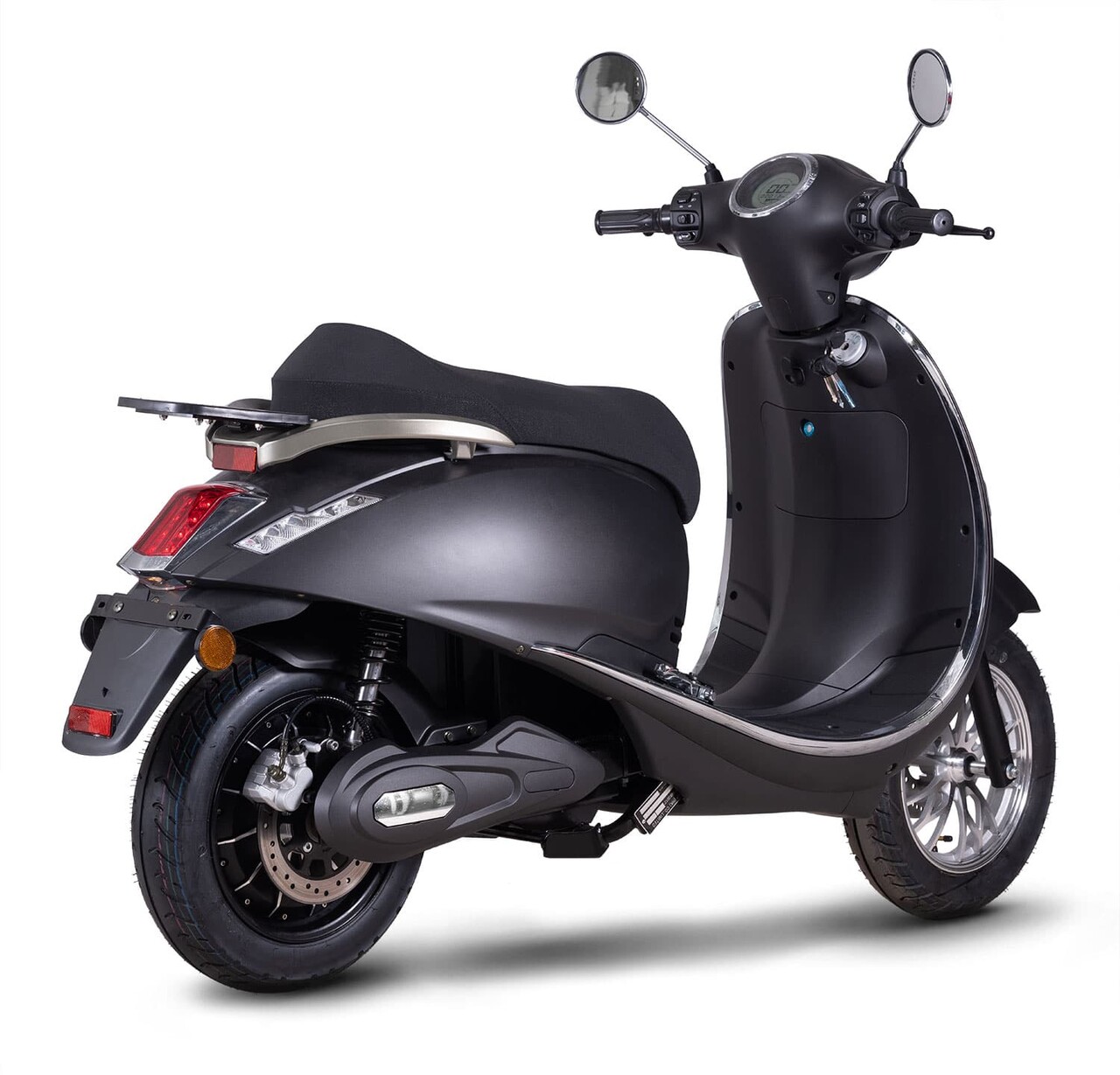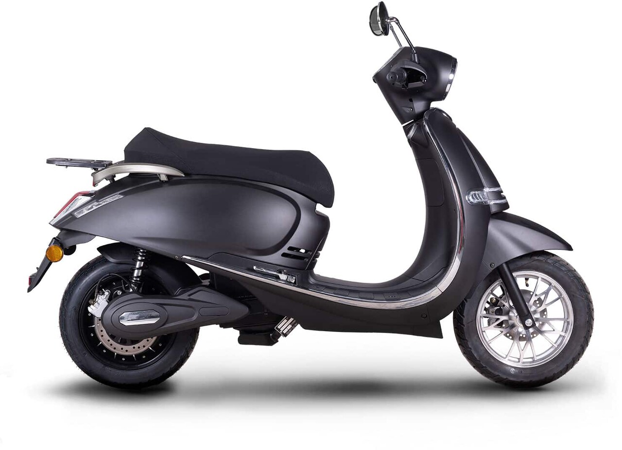 El escúter está disponible en varios colores y se puede equipar con un baúl superior.