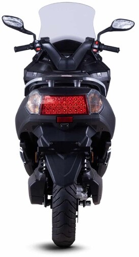 El escúter está disponible en varios colores y se puede equipar con un baúl superior.