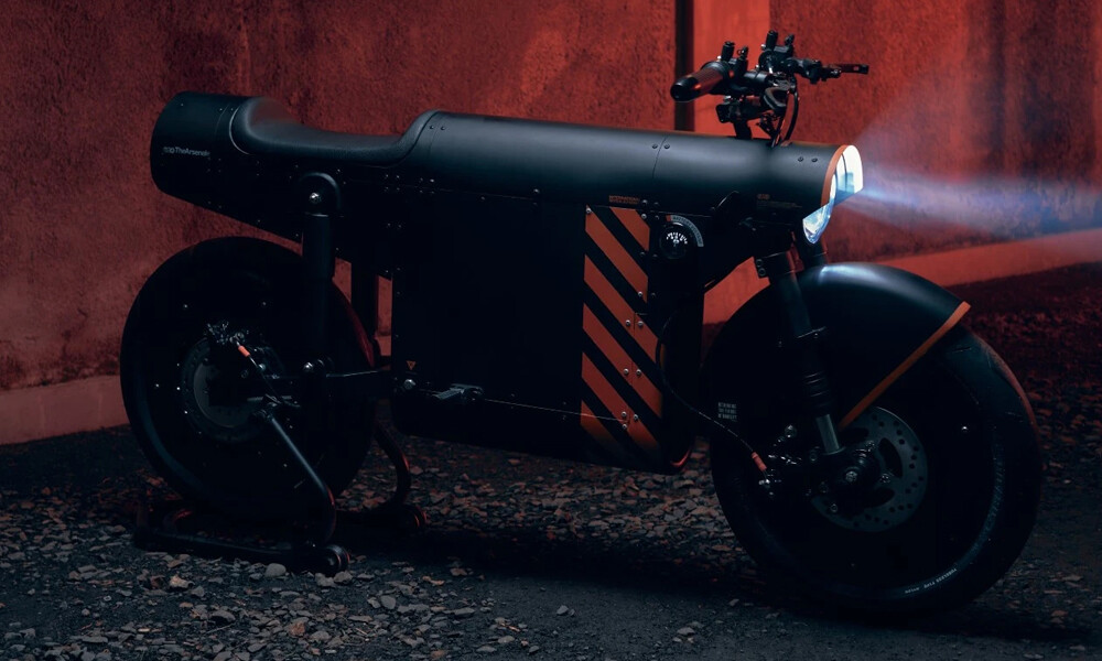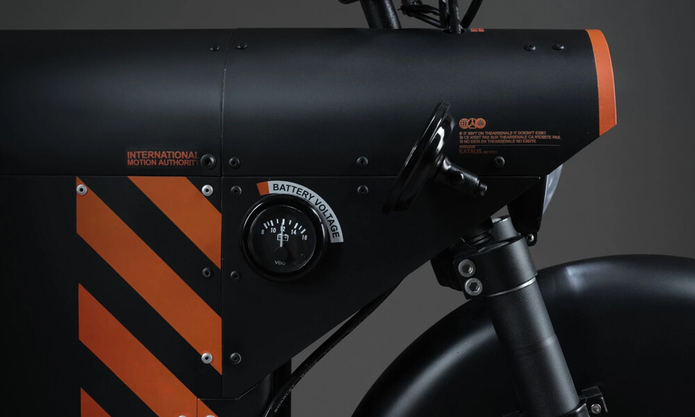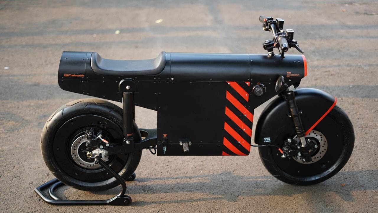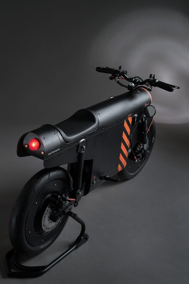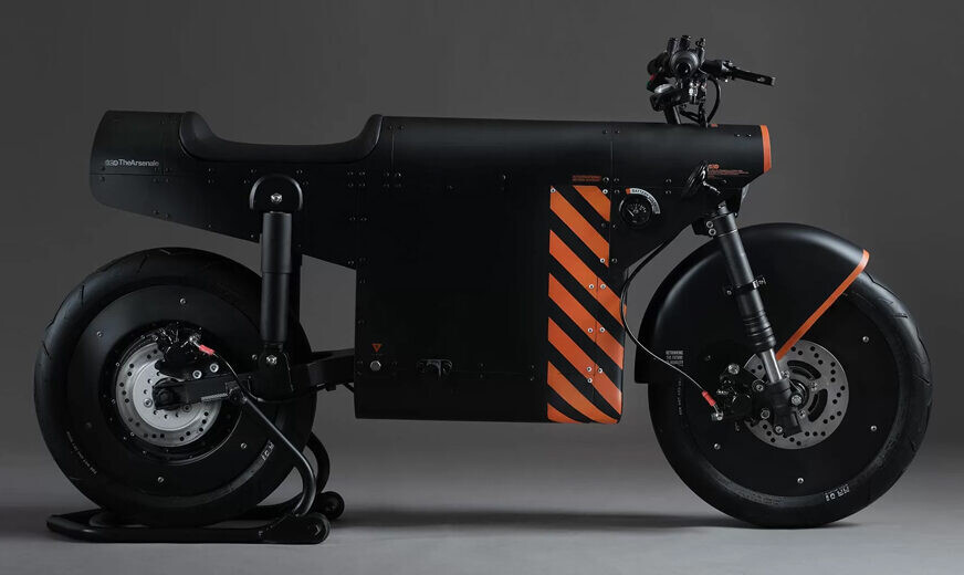 El diseño del EV-1000 - un color negro mate dominante envuelto con un patrón de franjas naranjas - está basado en la identidad corporativa de TheArsenale.