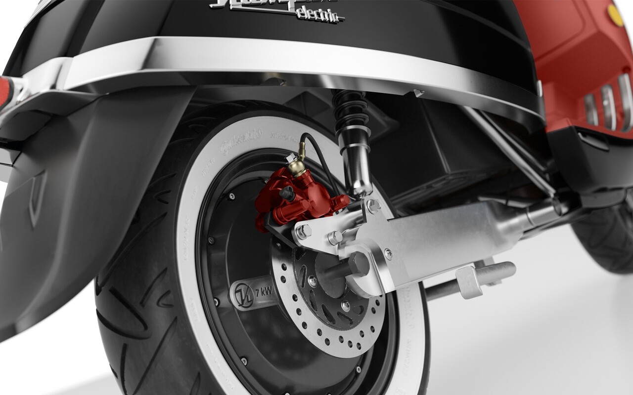 El scooter tiene un potente motor eléctrico 7.000 vatios que proporciona una aceleración excepcionalmente rápida. El scooter puede usarse en montañas con un pasajero trasero sin degradación del rendimiento.