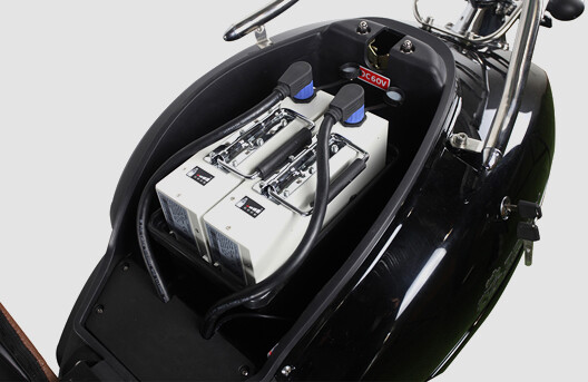 El patinete tiene tres baterías de litio extraíbles con una autonomía de 150 km. Las baterías son de alta calidad y son del mismo tipo que las baterías del Tesla Model S.