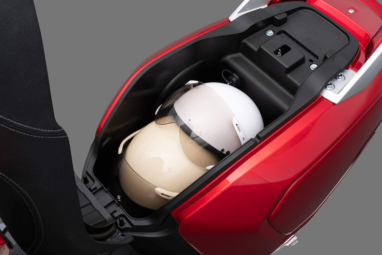 El asiento de acompañante proporciona espacio para 2 cascos y una laptop. El patinete cuenta con frenos de disco delanteros y traseros y unidades de iluminación LED.
